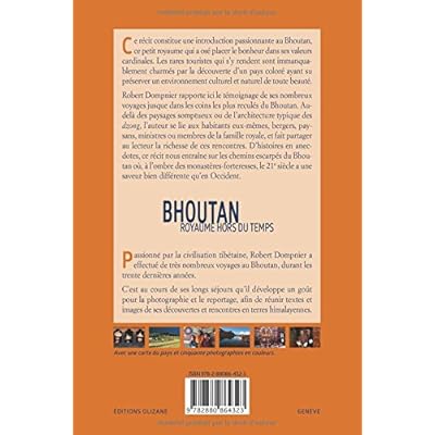 Ce récit constitue une introduction passionnante au Bhoutan, ce petit royaume qui a osé placer le bonheur dans ses valeurs cardinales. Les rares touristes qui s'y rendent sont immanquablement charmés par la découverte d'un pays coloré ayant su préserver un environnement culturel et naturel de toute beauté. Robert Dompnier rapporte ici le témoignage de ses nombreux voyages jusque dans les coins les plus reculés du Bhoutan. Au-delà des paysages somptueux ou de l'architecture typique des dzong, l'auteur se lie aux habitants eux-mêmes, bergers, paysans, ministres ou membres de la famille royale, et fait partager au lecteur la richesse de ces rencontres. D'histoires en anecdotes, ce récit nous entraîne sur les chemins escarpés du Bhoutan où, à l'ombre des monastères-forteresses, le 21e siècle a une saveur bien différente qu'en Occident. Passionné par la civilisation tibétaine, Robert Dompnier a effectué de très nombreux voyages au Bhoutan, durant les trente dernières années. C'est au cours de ses longs séjours qu'il développe un goût pour la photographie et le reportage, afin de réunir textes et images de ses découvertes et rencontres en terres himalayennes. Avec une carte du pays et cinquante photographies en couleurs.