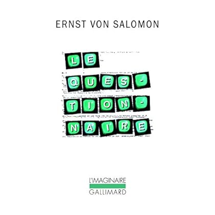 En 1945, dans une Allemagne occupée par les Alliés, les treize millions d'habitants de la zone sous contrôle américain sont soumis à un long questionnaire écrit censé mesurer leur degré de compromission avec le nazisme. L'opération sera un fiasco, les réponses étant le plus souvent mensongères, fantaisistes ou inexploitables : "Peu préparée aux complexités européennes, la bureaucratie militaire américaine le faisait même remplir aux étrangers trouvés en Allemagne [...]. À Dachau même, quelques jours après la Libération, chaque déporté français fut prié de s'y soumettre, et en quatorze exemplaires !" (Joseph Rovan)En utilisant comme canevas ces 131 questions, qu'il détourne parfois avec malice, Ernst von Salomon revisite la période 1933-1945. Le Questionnaire, qui s'imposa rapidement comme un best-seller, marque le retour en littérature de von Salomon. Ce gros livre passionnant, intelligent, amusant, est aussi un prodigieux document qui nous renseigne sur un personnage, une nation et une époque.